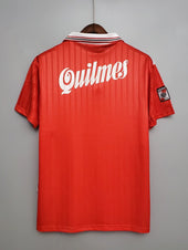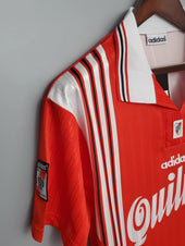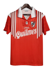 The River Plate away shirt from the 1996 season, crafted by Adidas, is a classic piece that reflects the club's storied history. This jersey features a vibrant red base with white accents, embodying a sleek and modern aesthetic. The prominent Quilmes sponsor adorns the front, while the Adidas logo and the River Plate crest are embroidered on the chest, adding to its distinguished look.