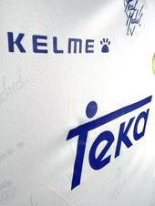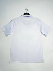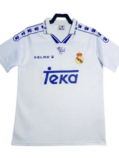El Camiseta Local del Real Madrid (1994-1996) un clásico atemporal que encarna la elegancia y el dominio de uno de los mayores clubes de fútbol. Diseñado por Kelme, esta icónica camiseta presenta un diseño elegante base blanca, acentuado con sutil borde morado, reflejando el estilo característico del Real Madrid. El Logo del patrocinador Teka, exhibido de manera prominente en el pecho, completa el look, convirtiéndolo en una pieza destacada de la era de mediados de los 90.