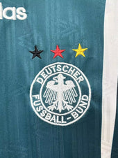 Il Maglia da trasferta della Germania del 1996, realizzato da Adidas, è un pezzo celebrato della storia del calcio, indossato durante la vittoriosa Germania UEFA Euro 1996 campagna. Questa maglia presenta un distintivo colore di base verde, completato da audaci design a tre strisce bianche Adidas che curvano dalle spalle fino alla parte anteriore. Il Emblema del Deutscher Fußball-Bund (DFB) è ricamato sul lato sinistro del petto, mentre il logo Adidas è posizionato a destra. Il colletto a V a coste incorpora i colori nazionali: nero, rosso e giallo, aggiungendo un tocco patriottico al design.