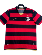 La maglia casalinga del CR Flamengo 2008-2009 cattura perfettamente lo spirito vibrante di uno dei club di calcio più celebrati del Brasile. Progettata da Nike, questa maglia presenta le iconiche strisce orizzontali rosse e nere, che rappresentano l'audace identità del club. Il logo dello sponsor Petrobras, ben visibile sul petto, aggiunge al suo fascino classico, mentre il ricamo dello stemma del Flamengo e i dettagli sottili la rendono un pezzo senza tempo per i tifosi.