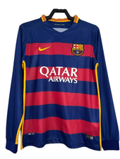 Il Maglia da casa a maniche lunghe del Barcellona della stagione 2015-16 ha introdotto un cambiamento audace nel design, caratterizzato da strisce blaugrana orizzontali per la prima volta nella storia del club. Questo look straordinario, realizzato da Nike, è stato indossato durante un'altra stagione dominante per i giganti catalani.