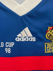 Il Maglia casalinga Francia 1998 è uno dei più maglie iconiche nella storia del calcio. Con il suo design blu audace, accenti rossi e bianchi, e ricamo dorato della Coppa del Mondo, questa maglietta è diventata un simbolo di orgoglio nazionale mentre la Francia sconfisse Brasile 3-0 nella finale. La partita ha visto Zidane (#10) ha segnato due colpi di testa cruciali, Emmanuel Petit (#17) sigilla la vittoria, e Didier Deschamps (#7) ha sollevato il trofeo come capitano, segnando l'inizio di un'era d'oro per il calcio francese.