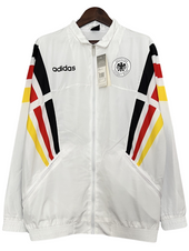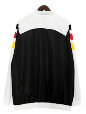 - Design Retro Classico – Un colpo d'occhio giacca a vento bianca con grassetto grafica nera, rossa e gialla sulle maniche, ispirato ai leggendari kit calcistici della Germania.
