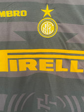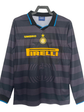 Il Maglia da trasferta a maniche lunghe dell'Inter Milan della stagione 1997-98 è uno dei design più iconici del club, simboleggiando una stagione piena di successo nazionale ed europeo. Caratterizzato da un design a righe nero e grigio in grassetto con accenti blu, questa maglia è strettamente legata al trionfo dell'Inter nel 1997-98 Coppa UEFA.