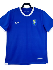 Il Maglia da trasferta del Brasile per la stagione 2006, realizzato da Nike, presenta un design classico ed elegante. Predominantemente blu reale, la maglia presenta accenti bianchi sul colletto e sui polsini delle maniche, incarnando i colori tradizionali associati ai kit alternativi del Brasile. Il stemma CBF (Confederação Brasileira de Futebol) è orgogliosamente esposto sul petto sinistro, con il logo Nike a destra.