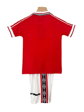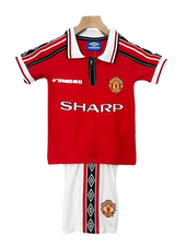 Questo kit casa storica caratteristiche il famosa maglietta rossa con lo sponsor Sharp, a colletto a pieghe con zip nera, e il pantaloni corti bianchi con dettagli a rombi neri e rossi. È stato indossato da David Beckham (#7), Ryan Giggs (#11), Dwight Yorke (#19) e Roy Keane (#16) in una delle stagioni più indimenticabili di sempre.