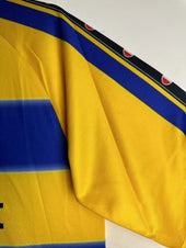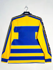 Il Maglia da casa a maniche lunghe del Parma AC della stagione 1999-00 è una maglia straordinaria di un'era d'oro nella storia del club. Caratterizzata dall'iconico strisce orizzontali gialle e bluQuesto kit è un simbolo della presenza competitiva di Parma in Serie A e nel calcio europeo.