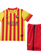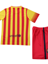 De Barcelona Uit Kids Kit van het seizoen 2013-14 is een van de meest unieke en historisch significante ontwerpen in de geschiedenis van de club. Met vetgele en rode verticale strepen, deze kit is een eerbetoon aan de Catalaanse vlag (La Senyera), het versterken van Barça’s identiteit en diepgewortelde verbinding met Catalonië.