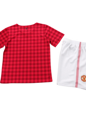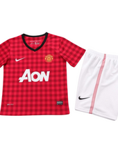 Deze kinderset bevat het thuisshirt van 2012-13 en bijpassende shorts , ontworpen voor comfort en ademend vermogen . Verkrijgbaar in kindermaten 16 tot 28 (leeftijden 2 tot 13 ), ideaal voor jonge fans die dromen van spelen als hun United-helden.