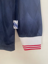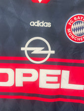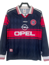 The 1997-1999 Bayern Munich away shirt is a legendary jersey from a golden period in the club’s history. Designed by Adidas, this long-sleeve version features a deep navy blue base with a subtle diamond pattern, complemented by red horizontal stripes and the iconic Opel sponsor. The fold-over collar with white and red trim gives the shirt a timeless look, making it a favorite among collectors and Bayern fans.