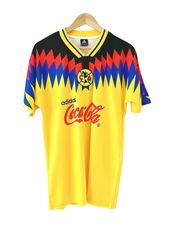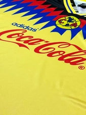 The Club América Home Shirt (1995-1996) is a striking symbol of one of Mexico’s most iconic football clubs. Featuring a bold yellow base with a dynamic blue and red "V" pattern across the chest, this jersey, crafted by Adidas, reflects the vibrant energy and passion of Club América. The Coca-Cola sponsor logo further enhances its retro appeal, making it a standout design from the mid-'90s.