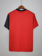 The Spain home shirt from 1996, designed by Adidas, is a classic piece that reflects the vibrant football culture of the nation. This jersey features a rich red base with a distinctive navy blue panel running down the left side, adorned with three vertical yellow stripes, representing the national colors. The Adidas logo is centrally placed below the neckline, with the Spanish national team crest proudly displayed on the left chest. The shirt is complemented by a navy blue collar, adding to its traditional aesthetic.